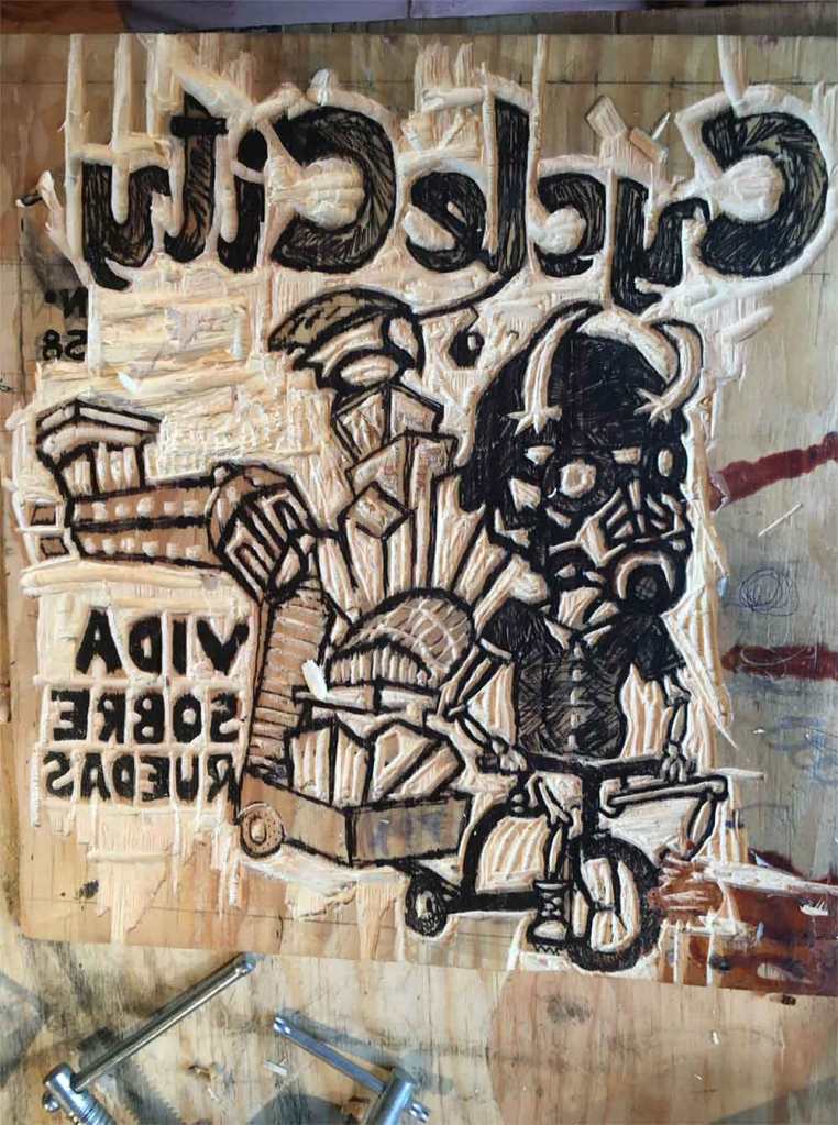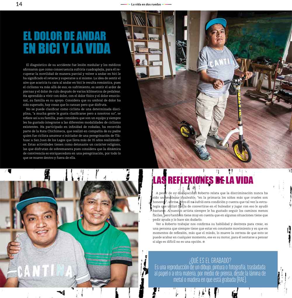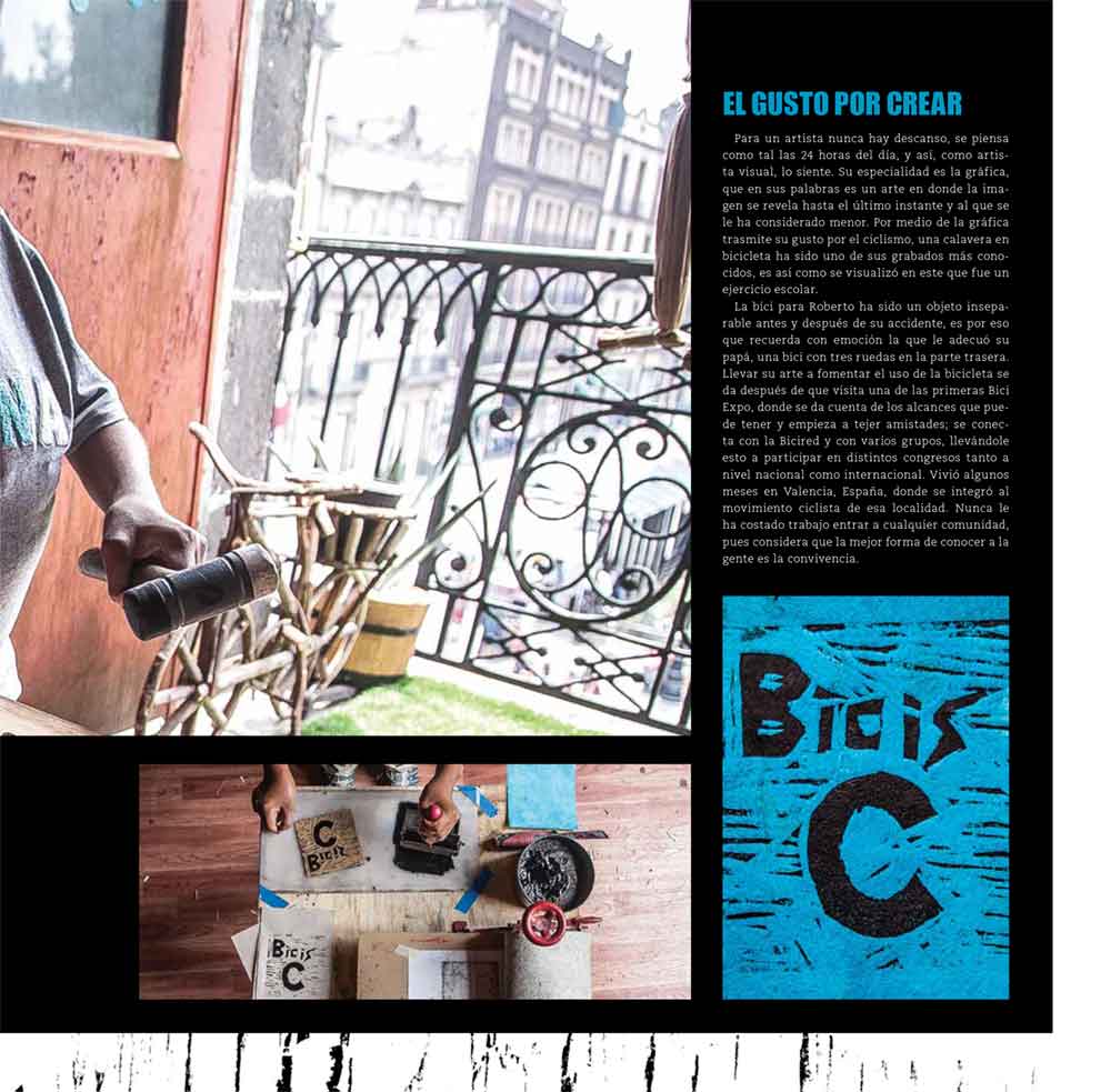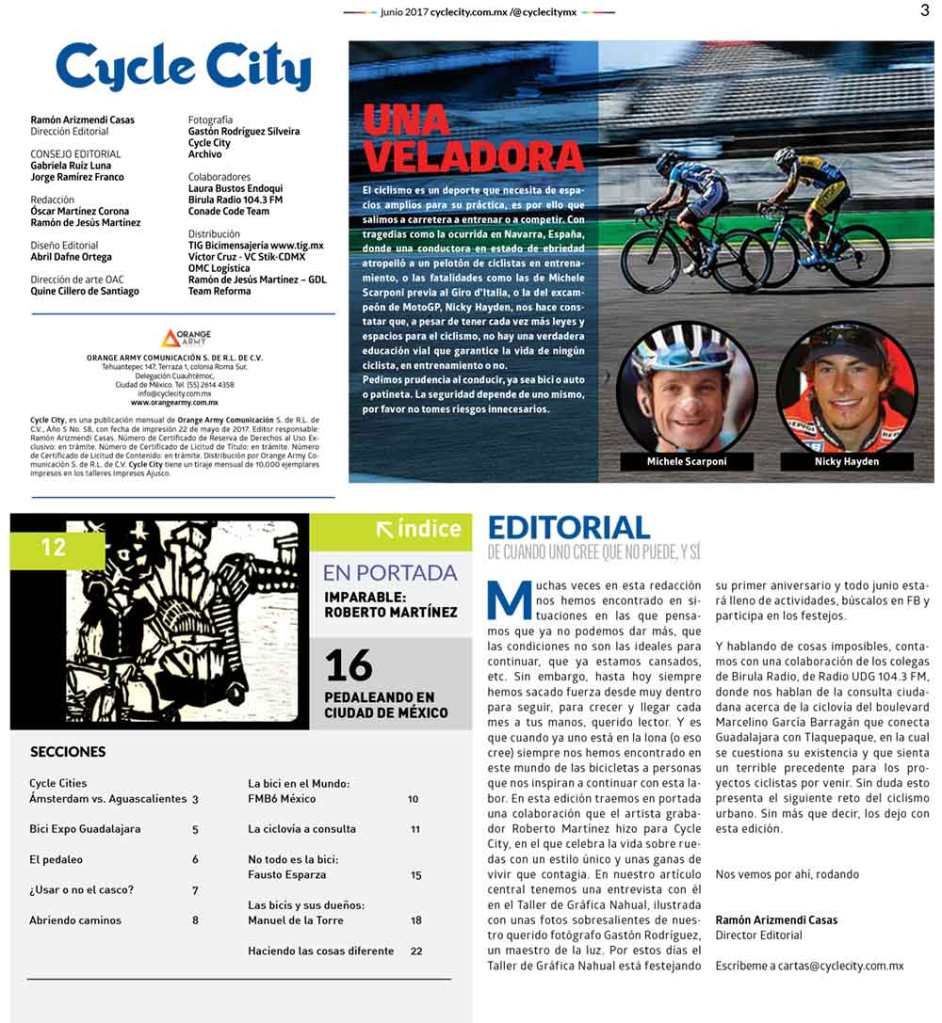 “Muchas veces en esta redacción nos hemos encontrado en situaciones en las que pensamos que ya no podemos dar más, que las condiciones no son las ideales para continuar, que ya estamos cansados, etc. Sin embargo, hasta hoy siempre hemos sacado fuerza desde muy dentro para seguir, para crecer y llegar cada mes a tus manos, querido lector. Y es que cuando ya uno está en la lona (o eso cree) siempre nos hemos encontrado en este mundo de las bicicletas a personas que nos inspiran a continuar con esta labor. En esta edición traemos en portada una colaboración que el artista grabador Roberto Martínez hizo para Cycle City, en el que celebra la vida sobre ruedas con un estilo único y unas ganas de vivir que contagia. En nuestro artículo central tenemos una entrevista con él en el Taller de Gráfica Nahual, ilustrada con unas fotos sobresalientes de nuestro querido fotógrafo Gastón Rodríguez, un maestro de la luz. Por estos días el Taller de Gráfica Nahual está festejando su primer aniversario y todo junio estará lleno de actividades, búscalos en FB y participa en los festejos.