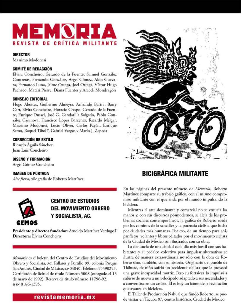 En las páginas del presente número de Memoria, Roberto Martínez comparte su trabajo gráfico, con el mismo compromiso militante con el que anda por el mundo impulsando la bicicleta.