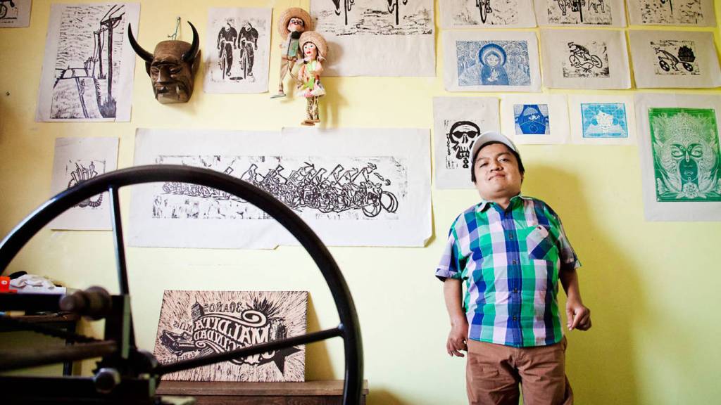 «Hace unas semanas recibí una llamada de Moyenei, esposa de Roco Pachucote. La propuesta fue hacer un grabado para celebrar los 30 años de La Maldita. Lo querían en madera por la textura del material y por la fuerza que proyecta un grabado en madera. Era lunes y lo querían para el jueves en la mañana. Siempre me preguntan cuanto tardo en hacer una grabado. Lo puedo hacer en semanas, días, horas o en un año. Lo tenía que terminar en dos días, por que el lunes ya se había ido. Esa misma tarde me llamó Roco para preguntar si era posible que quedara listo tan rápido. Le dije que no había ningún problema, ¿cómo decirle que no? El miércoles a media noche termine de tallar y lo imprimí. Fue un gran reto, pero quedo listo para el concierto de celebración en el Foro Sol.